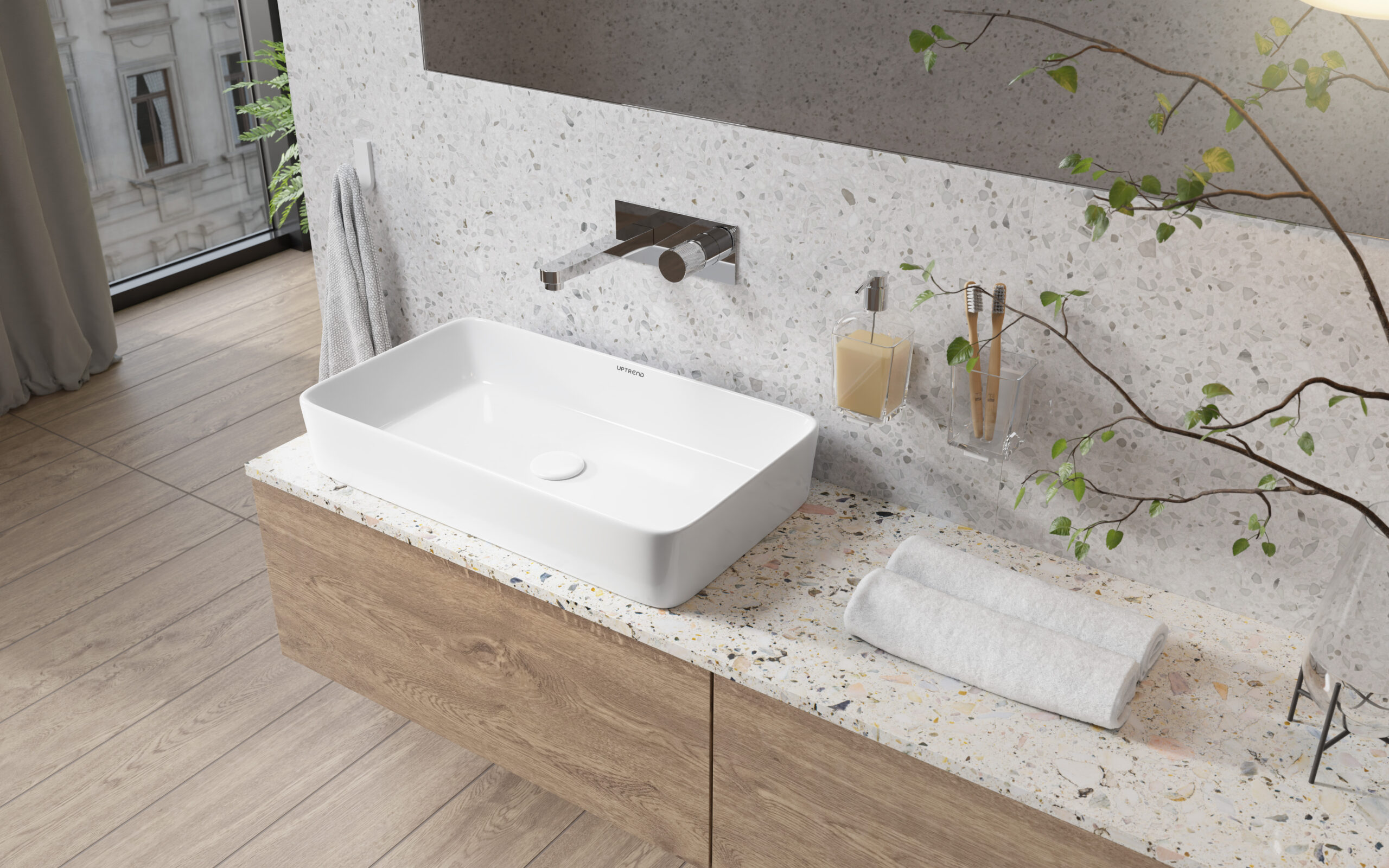 Podkreśl surowy charakter łazienki z modelem prostokątnej umywalki nablatowej Athena. Duża zaletą tego modelu jest uniwersalny i funkcjonalny kształt oraz forma, która zapewnia swobodę w doborze dodatków do rustykalnej łazienki.