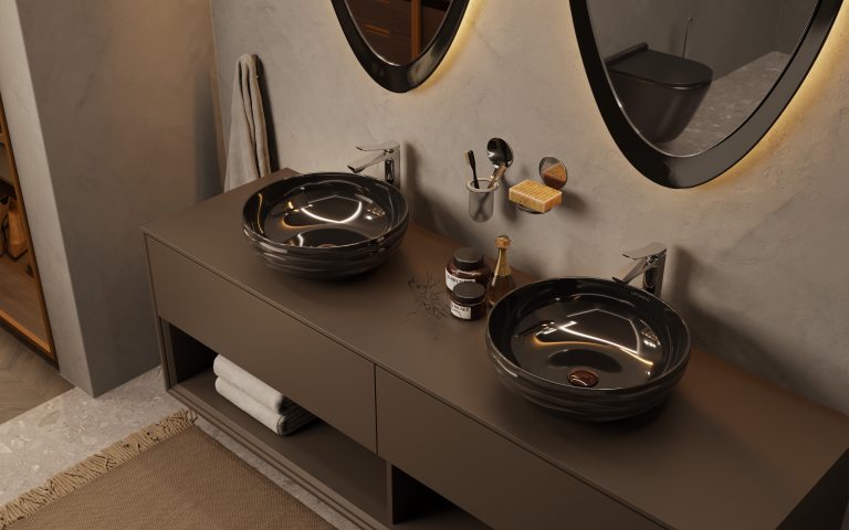 Cechą szczególna umywalki Arya to błyszcząca piękna czerń oraz ozdobna faktura na zewnętrznej stronie umywalki. Umywalka ta świetnie pasuje do nieszablonowych projektów.