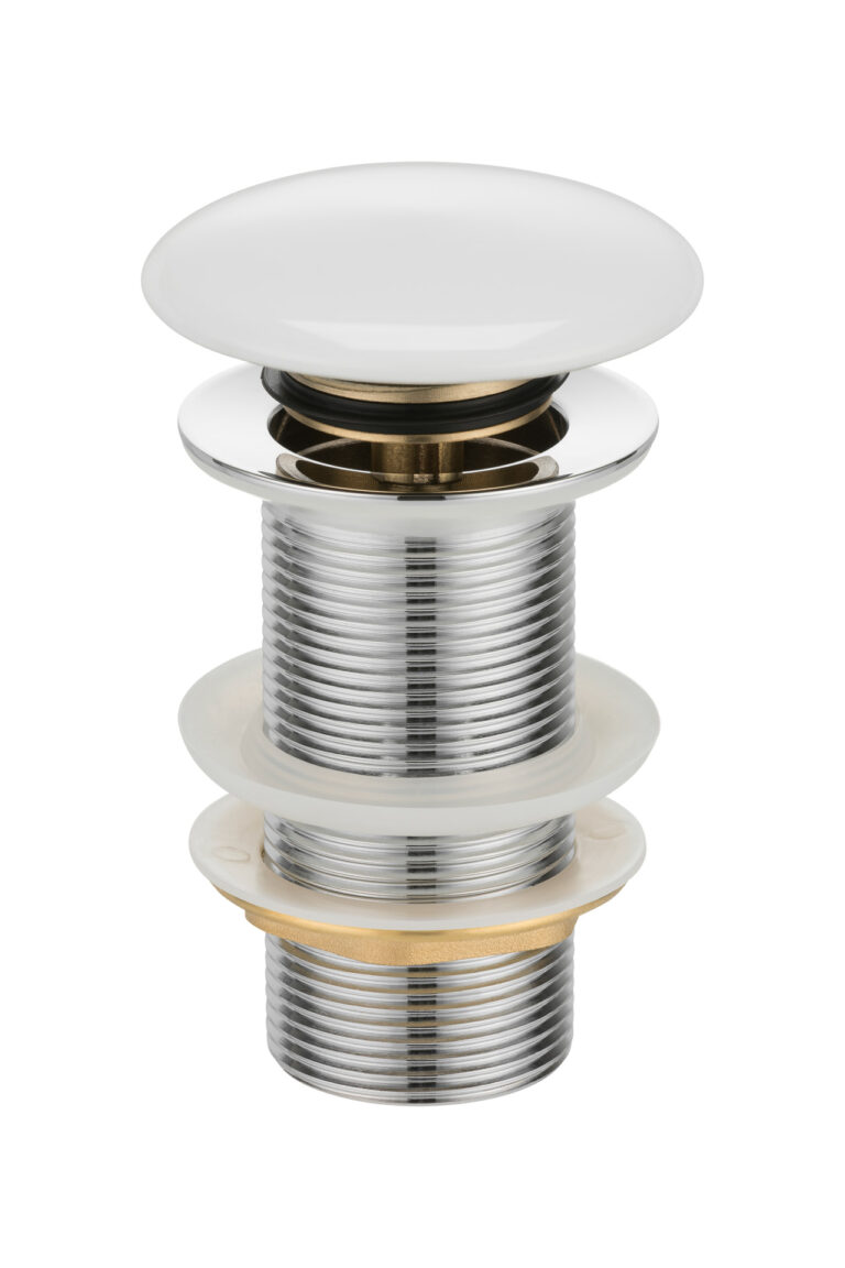 Korek ceramiczny bez przelewu click-clack F008-18 wykonany ze stali oraz mosiądzu. Górna część korka wykonana z ceramiki w kolorze błyszczącej bieli.