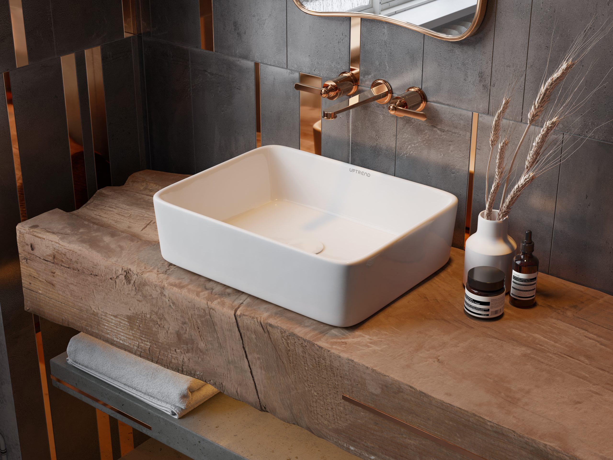 W umywalkach nablatowych bez otworu na baterię, armatura (bateria) znajduje się na ścianie, dzięki montażowi podtynkowemu, bądź jest przymocowana do blatu poza misą umywalki. Obie wersje zaprezentowane na poniższych wizualizacjach są praktycznymi i funkcjonalnymi rozwiązaniami, które sprawdzą się w nowoczesnych łazienkach.